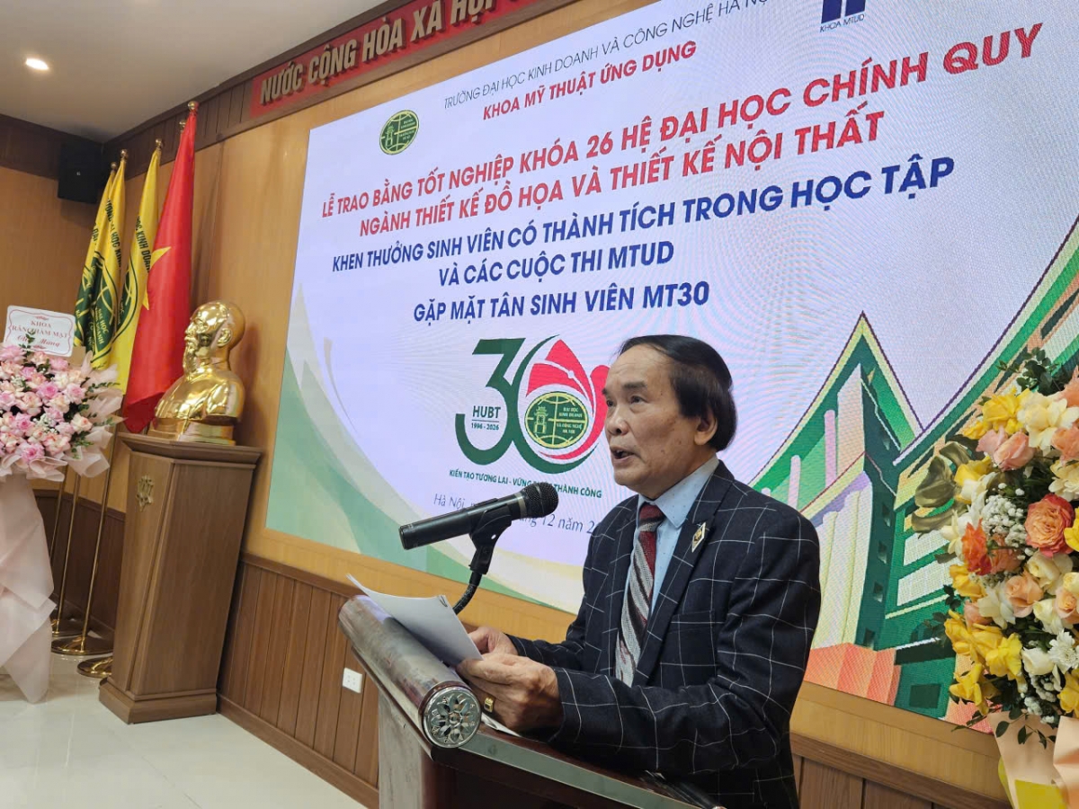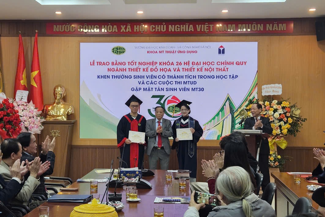 BTĐKT - Sáng 19/12, tại Hà Nội, Khoa Mỹ thuật ứng dụng, Trường Đại học Kinh doanh và Công nghệ Hà Nội tổ chức Lễ trao bằng tốt nghiệp khóa 26 hệ đại học chính quy ngành Thiết kế đồ họa và Thiết kế nội thất; khen thưởng sinh viên có thành tích trong học tập và các cuộc thi mỹ thuật ứng dụng, gặp mặt tân sinh viên khóa 30.