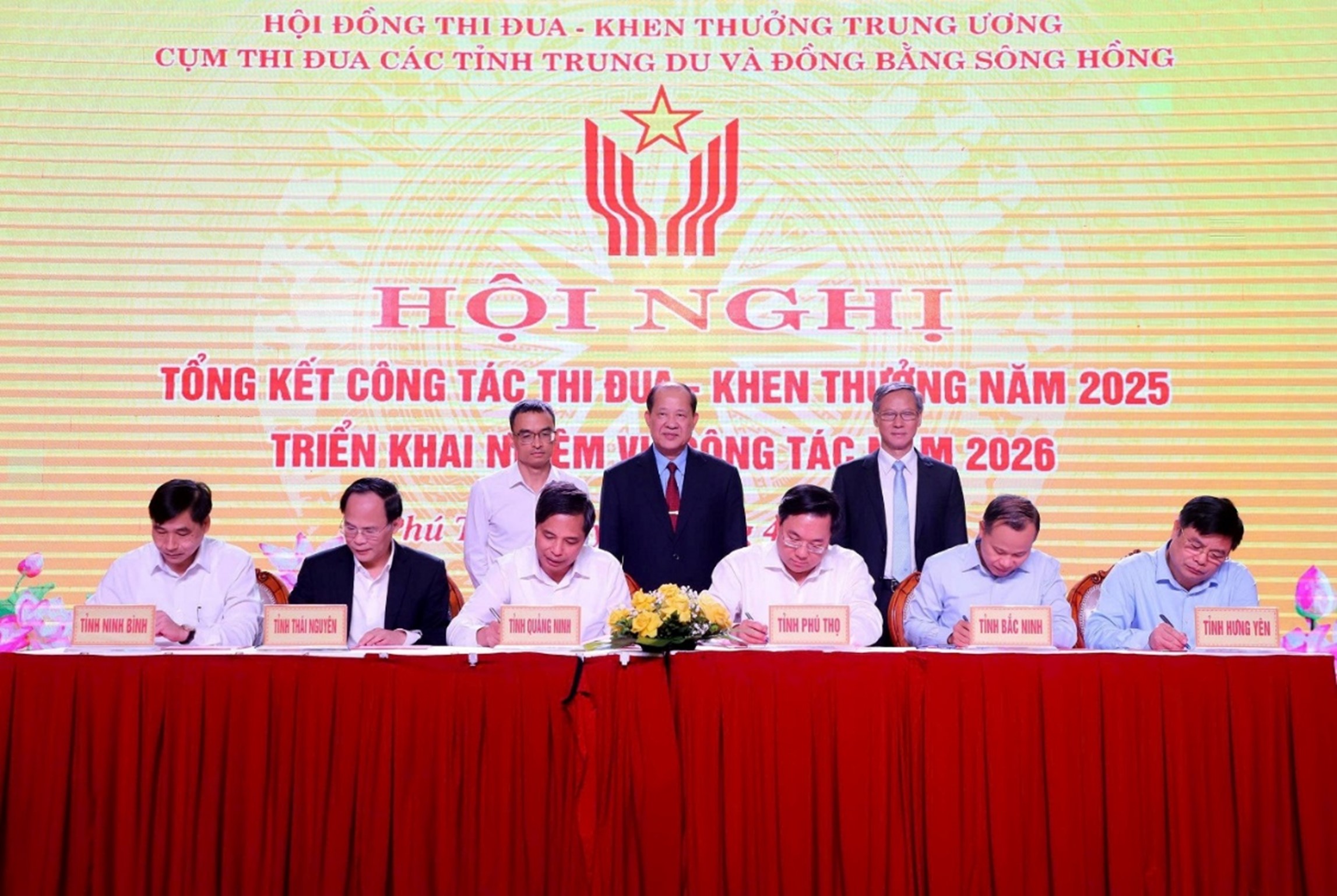 BTĐKT - Sáng ngày 1/4, tại tỉnh Phú Thọ, Cụm thi đua các tỉnh Trung du và Đồng bằng sông Hồng (bao gồm các tỉnh: Phú Thọ, Quảng Ninh, Thái Nguyên, Bắc Ninh, Hưng Yên và Ninh Bình) đã tổ chức Hội nghị tổng kết công tác thi đua, khen thưởng năm 2025 và triển khai phương hướng, nhiệm vụ năm 2026. Dự hội nghị có các đồng chí: Bế Xuân Trường, nguyên Ủy viên Trung ương Đảng, Phó Chủ tịch Ủy ban Trung ương Mặt trận Tổ quốc Việt Nam, Chủ tịch Hội Cựu chiến binh Việt Nam, thành viên Hội đồng Thi đua – Khen thưởng Trung ương phụ trách Cụm thi đua; Trần Duy Đông, Chủ tịch UBND tỉnh Phú Thọ cùng đại diện lãnh đạo UBND các tỉnh trong Cụm và đại diện các sở, ban, ngành liên quan. Về phía Ban Thi đua - Khen thưởng Trung ương, có các đồng chí: Phan Văn Hùng, Phó Trưởng ban; Đỗ Trọng Hùng, Trưởng Phòng Thi đua – Khen thưởng các tỉnh, thành phố trực thuộc trung ương; Nguyễn Văn Thuật, Trưởng Phòng Pháp chế và Giải quyết khiếu nại, tố cáo; Nguyễn Hồng Tiến, Giám đốc Trung tâm Thông tin - Truyền thông cùng các chuyên viên phòng chuyên môn. Đại diện lãnh đạo Ban Thi đua – Khen thưởng Trung ương dự hội nghị Năm 2025 được xác định là năm có ý nghĩa đặc biệt quan trọng, là năm cuối thực hiện các mục tiêu nhiệm kỳ 2020 - 2025. Trong bối cảnh tình hình thế giới và trong nước còn nhiều khó khăn, thách thức, các tỉnh trong Cụm đã phát huy tinh thần “Càng khó khăn càng phải thi đua”, triển khai hiệu quả các phong trào thi đua yêu nước thiết thực, bám sát nhiệm vụ trọng tâm, cấp bách, gắn với phương châm điều hành của Chính phủ “Kỷ cương - trách nhiệm; chủ động - kịp thời; tinh gọn - hiệu quả; tăng tốc - bứt phá”, cùng tinh thần hành động quyết liệt “Dám nghĩ, dám làm, dám đột phá vì lợi ích chung”. Qua đó, góp phần quan trọng thúc đẩy phát triển kinh tế - xã hội, bảo đảm quốc phòng, an ninh trên địa bàn. Đồng chí Trần Duy Đông, Chủ tịch UBND tỉnh Phú Thọ phát biểu khai mạc hội nghị Báo cáo tại hội nghị cho thấy, công tác lãnh đạo, chỉ đạo về thi đua, khen thưởng tiếp tục được các tỉnh quan tâm, triển khai đồng bộ, bám sát các chủ trương của Đảng, chính sách, pháp luật của Nhà nước. Việc cụ thể hóa Luật Thi đua, khen thưởng năm 2022 và các chỉ đạo của trung ương được thực hiện nghiêm túc, góp phần nâng cao hiệu lực, hiệu quả quản lý nhà nước trong lĩnh vực này. Trong năm 2025, các phong trào thi đua do Thủ tướng Chính phủ phát động được triển khai sâu rộng, nổi bật như: Phong trào “Cả nước thi đua đổi mới sáng tạo và chuyển đổi số”, “Đẩy mạnh phát triển kết cấu hạ tầng đồng bộ, hiện đại; thực hành tiết kiệm, chống lãng phí”, “Cả nước chung sức xây dựng nông thôn mới”, “Vì người nghèo - Không để ai bị bỏ lại phía sau”… Các phong trào đã tạo khí thế thi đua sôi nổi, lan tỏa sâu rộng trong toàn hệ thống chính trị và các tầng lớp nhân dân, góp phần thúc đẩy phát triển toàn diện trên các lĩnh vực . Các đơn vị trong Cụm thi đua các tỉnh Trung du và Đồng bằng sông Hồng ký kết giao ước thi đua năm 2026 Đặc biệt, phong trào thi đua cao điểm “500 ngày đêm hoàn thành 3.000 km đường bộ cao tốc” đã được các địa phương triển khai quyết liệt, góp phần đẩy nhanh tiến độ các dự án trọng điểm, tăng cường kết nối vùng, tạo động lực phát triển kinh tế - xã hội liên vùng. Nhờ đó, kết quả phát triển kinh tế - xã hội của các tỉnh trong Cụm đạt nhiều dấu ấn tích cực. Nhiều địa phương ghi nhận tốc độ tăng trưởng GRDP ở mức cao như: Quảng Ninh đạt 11,89%, Ninh Bình đạt 10,65%, Phú Thọ đạt 10,52%, Bắc Ninh đạt 10,27%; thu ngân sách, kim ngạch xuất khẩu, giải ngân vốn đầu tư công đều đạt và vượt kế hoạch đề ra. Chuyển đổi số tiếp tục có bước tiến tích cực, với chỉ số DTI của nhiều tỉnh duy trì thứ hạng cao; tỷ lệ cán bộ, công chức, viên chức và người dân được trang bị kỹ năng số ngày càng tăng. Chương trình xây dựng nông thôn mới đạt nhiều kết quả quan trọng, nhiều địa phương hoàn thành 100% số xã đạt chuẩn; chương trình OCOP phát triển mạnh với hàng nghìn sản phẩm đạt từ 3 sao trở lên, góp phần nâng cao giá trị nông sản và phát triển kinh tế nông thôn. Đồng chí Bế Xuân Trường tặng hoa chúc mừng 2 đơn vị Cụm trưởng và Cụm phó Cụm thi đua năm 2026 Công tác giảm nghèo đạt nhiều kết quả tích cực, tiêu biểu như Quảng Ninh không còn hộ nghèo; các tỉnh khác giảm mạnh tỷ lệ hộ nghèo đa chiều. Phong trào xóa nhà tạm, nhà dột nát được triển khai hiệu quả, nhiều địa phương hoàn thành 100% kế hoạch, góp phần đảm bảo an sinh xã hội và nâng cao chất lượng cuộc sống cho người dân... Công tác khen thưởng của các tỉnh trong năm qua được thực hiện kịp thời, công khai, đúng quy định, chú trọng tới người lao động trực tiếp. Trong năm 2025, toàn Cụm có 