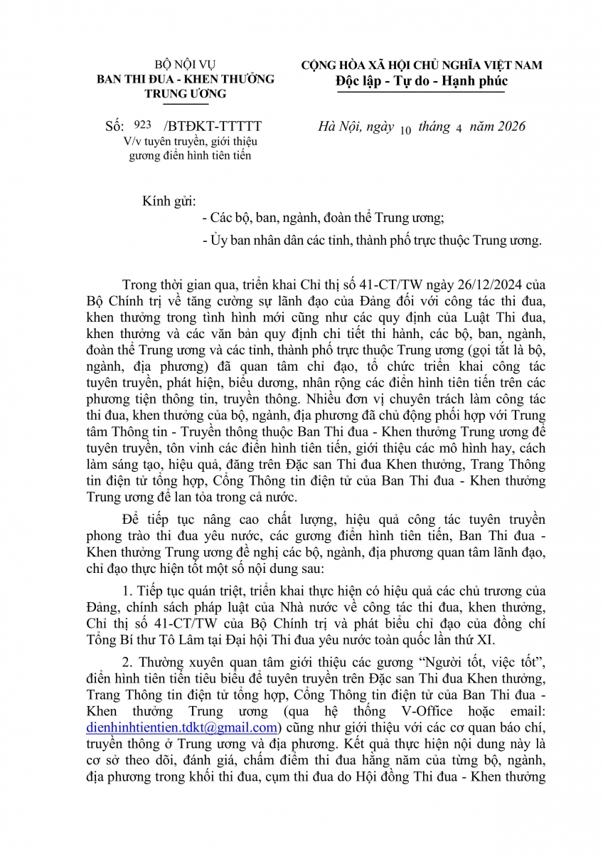 Công văn số 923/BTĐKT-TTTTTT ngày 10/4/2026 của Ban Thi đua - Khen thưởng Trung ương về việc tuyên truyền, giới thiệu gương điển hình tiên tiến