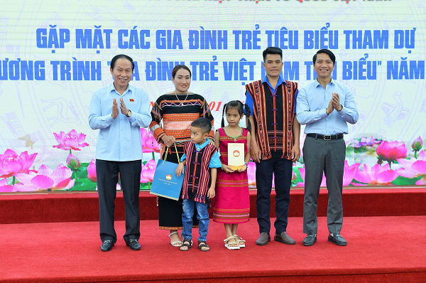 Ông Lê Tiến Châu, Ủy viên Trung ương Đảng, Phó Chủ tịch – Tổng Thư ký Ủy ban Trung ương MTTQ Việt Nam và anh Nguyễn Ngọc Lương, Bí thư Thường trực T.Ư Đoàn, Chủ tịch Hội Liên hiệp Thanh niên Việt Nam tặng quà cho các gia đình trẻ tiêu biểu năm 2022 tại buổi gặp mặt chiều 1/11