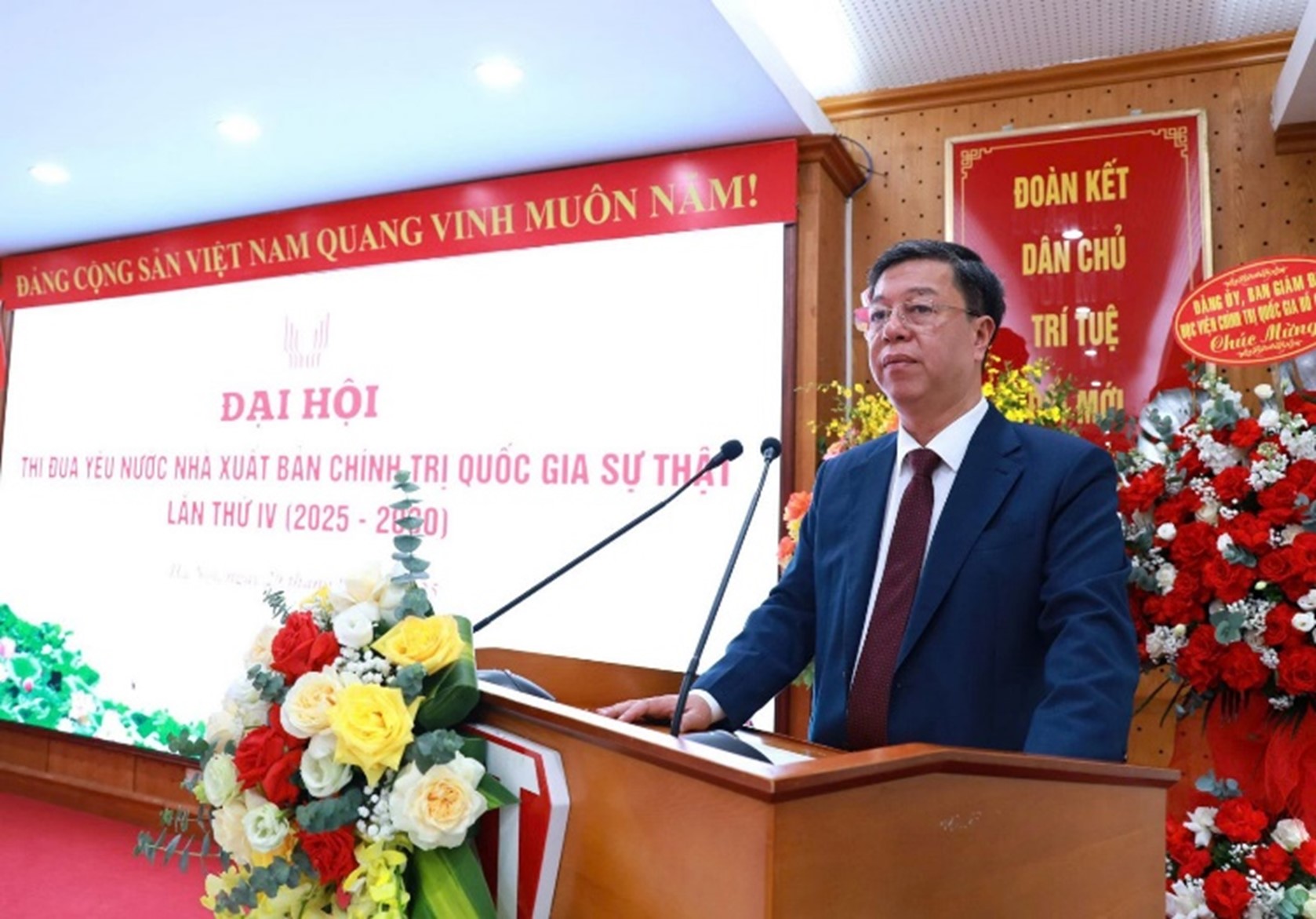 BTĐKT - Chiều 29/9, tại Hà Nội, Nhà xuất bản Chính trị quốc gia Sự thật tổ chức trọng thể Đại hội Thi đua yêu nước lần thứ IV, giai đoạn 2025 - 2030. Đại hội là dấu mốc quan trọng nhằm tổng kết, đánh giá kết quả, chỉ ra hạn chế trong công tác thi đua, khen thưởng giai đoạn 2020 - 2025; đồng thời đề ra phương hướng, mục tiêu, giải pháp cho giai đoạn mới, xây dựng Nhà xuất bản chính quy, chuyên nghiệp, hiện đại, xứng đáng là cơ quan xuất bản lý luận, chính trị của Trung ương Đảng. PGS.TS Vũ Trọng Lâm, Giám đốc, Tổng Biên tập Nhà xuất bản Chính trị quốc gia Sự thật phát biểu khai mạc đại hội Phát biểu khai mạc đại hội, PGS.TS Vũ Trọng Lâm, Giám đốc, Tổng Biên tập Nhà xuất bản Chính trị quốc gia Sự thật khẳng định: Thấm nhuần lời dạy của Chủ tịch Hồ Chí Minh: “Thi đua là yêu nước, yêu nước thì phải thi đua”, các phong trào thi đua tại Nhà xuất bản đã trở thành biện pháp hiệu quả khơi dậy tinh thần đoàn kết, đổi mới, sáng tạo, nỗ lực vượt khó, hoàn thành xuất sắc nhiệm vụ chính trị. Qua đó, chất lượng công tác biên tập, xuất bản, phát hành, nghiên cứu khoa học, tuyên truyền, giới thiệu sách ngày càng nâng cao, góp phần bồi dưỡng nhận thức chính trị của cán bộ, đảng viên và nhân dân; xây dựng Đảng, hệ thống chính trị trong sạch, vững mạnh. Trong 5 năm qua, công tác thi đua, khen thưởng được lãnh đạo Nhà xuất bản quan tâm chỉ đạo sát sao, gắn chặt với nhiệm vụ chính trị và học tập, làm theo tư tưởng, đạo đức, phong cách Hồ Chí Minh. Đặc biệt, Đề án trang bị sách cho xã, phường, thị trấn đã đưa hàng trăm đầu sách về cơ sở, lan tỏa tri thức lý luận, chính trị, pháp luật, góp phần xây dựng nông thôn mới văn minh, hiện đại. Trong giai đoạn 2020 - 2025, Nhà xuất bản đã biên tập, xuất bản hơn 2.500 đầu sách giấy với gần 28 triệu bản in, cùng hơn 1.000 đầu sách điện tử. Nhiều tủ sách điện tử chuyên đề như Tủ sách bảo vệ nền tảng tư tưởng của Đảng, Tủ sách chi bộ điện tử, Tủ sách Chủ tịch Hồ Chí Minh, Tủ sách Tổng Bí thư Nguyễn Phú Trọng, Tủ sách pháp luật… đã được phát triển và trao tặng cho 55 cơ quan, đơn vị, địa phương, với gần 8.000 tài khoản, phục vụ hàng triệu độc giả trong và ngoài nước. Trong nghiên cứu khoa học, Nhà xuất bản triển khai 14 đề tài cấp Ban Đảng Trung ương, 26 đề án cấp cơ sở; tổ chức 1 hội thảo khoa học quốc tế, 37 hội thảo quốc gia, 36 tọa đàm khoa học. Tạp chí Chính trị và Phát triển được nâng cấp, tính điểm khoa học ở nhiều ngành, liên ngành. Hoạt động đối ngoại mở rộng, quảng bá sách lý luận, chính trị Việt Nam ra thế giới. Nhờ những nỗ lực toàn diện, vị thế và uy tín của Nhà xuất bản ngày càng được khẳng định. Nhiều bộ sách, công trình lý luận, chính trị có giá trị được xuất bản, góp phần quan trọng vào việc quán triệt, tổ chức thực hiện đường lối, chính sách của Đảng và Nhà nước; bảo vệ nền tảng tư tưởng của Đảng, phục vụ công cuộc xây dựng, phát triển đất nước. Đời sống vật chất, tinh thần của cán bộ, viên chức, người lao động ngày càng được cải thiện; tinh thần trách nhiệm, lòng tự hào nghề nghiệp được bồi đắp, lan tỏa. Công tác phát hiện, bồi dưỡng, nhân rộng điển hình tiên tiến được triển khai thường xuyên, gắn với nhiệm vụ chuyên môn. Nhiều tập thể, cá nhân đạt thành tích cao trong các cuộc thi bảo vệ nền tảng tư tưởng của Đảng, có nhiều sáng kiến, giải pháp hữu ích. Đồng chí Nguyễn Thị Hoàng Vân, Phó Bí thư Đảng ủy các cơ quan Đảng Trung ương phát biểu tại đại hội Phát biểu tại đại hội, đồng chí Nguyễn Thị Hoàng Vân, Phó Bí thư Đảng ủy các cơ quan Đảng Trung ương đánh giá cao kết quả toàn diện Nhà xuất bản đạt được. Đồng chí khẳng định, những kết quả này thể hiện tinh thần nỗ lực, đoàn kết, trách nhiệm cao của tập thể cán bộ, đảng viên, người lao động. Đồng chí nhấn mạnh, bước vào giai đoạn 2025 - 2030, Nhà xuất bản cần tiếp tục đổi mới, khẳng định vai trò cơ quan xuất bản chính trị - tư tưởng của Đảng; đẩy mạnh chuyển đổi số, đa dạng hóa ấn phẩm, phương thức phát hành; chú trọng xây dựng đội ngũ bản lĩnh, giỏi chuyên môn, làm chủ công nghệ; đồng thời tăng cường mở rộng hợp tác quốc tế, lan tỏa giá trị tư tưởng, lý luận của Đảng, nâng cao uy tín Việt Nam trên trường quốc tế. PGS.TS. Vũ Trọng Lâm, Bí thư Đảng ủy, Giám đốc - Tổng Biên tập, Chủ tịch Hội đồng Thi đua - Khen thưởng Nhà xuất bản trao Huân chương Lao động hạng Nhất cho Ban sách Giáo khoa và Tham khảo Tại đại hội, nhiều tập thể, cá nhân xuất sắc giai đoạn 2020 - 2025 đã được trao Huân chương Lao động hạng Nhất, Nhì, Ba; Cờ thi đua của Chính phủ; Bằng khen của Thủ tướng; Cờ thi đua và Bằng khen của Nhà xuất bản. Dịp này, thay m