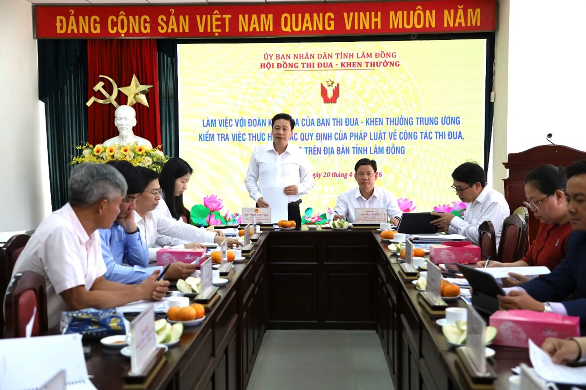 BTĐKT - Ngày 20/4, tại Lâm Đồng, Đoàn Kiểm tra của Ban Thi đua - Khen thưởng Trung ương đã công bố Quyết định kiểm tra việc thực hiện các quy định của pháp luật về thi đua, khen thưởng trên địa bàn tỉnh Lâm Đồng. Toàn cảnh buổi làm việc Dự buổi công bố, về phía Đoàn Kiểm tra Ban Thi đua - Khen thưởng Trung ương, có các đồng chí: Phạm Đức Toàn, Phó Trưởng ban Ban Thi đua - Khen thưởng Trung ương, Trưởng đoàn; Nguyễn Văn Thuật, Trưởng phòng Phòng Pháp chế và giải quyết khiếu nại, tố cáo, Phó Trưởng đoàn; các thành viên của Đoàn Kiểm tra. Tiếp và làm việc với Đoàn Kiểm tra có các đồng chí: Đỗ Văn Chung, Giám đốc Sở Nội vụ, Phó Chủ tịch Thường trực Hội đồng Thi đua - Khen thưởng tỉnh Lâm Đồng; Trần Hữu Tuấn, Phó Giám đốc Sở Nội vụ, Ủy viên Thường trực Hội đồng Thi đua - Khen thưởng tỉnh Lâm Đồng; một số đồng chí thành viên Hội đồng Thi đua - Khen thưởng tỉnh; đại diện lãnh đạo một số sở, ngành, đại diện lãnh đạo các cơ quan, đơn vị được kiểm tra trực tiếp; đại diện Văn phòng Sở Nội vụ, Phòng Thi đua - Khen thưởng, Sở Nội vụ tỉnh Lâm Đồng. Tại buổi làm việc, Đoàn Kiểm tra đã công bố Quyết định số 10/QĐ-BTĐKT ngày 08/4/2026 của Trưởng ban Ban Thi đua - Khen thưởng Trung ương kiểm tra việc thực hiện các quy định của pháp luật về thi đua, khen thưởng trên địa bàn tỉnh Lâm Đồng, giai đoạn từ ngày 01/01/2024 đến ngày 31/12/2025. Đồng chí Trần Hữu Tuấn, Phó Giám đốc Sở Nội vụ, Ủy viên Thường trực Hội đồng Thi đua - Khen thưởng tỉnh Lâm Đồng báo cáo tại buổi làm việc Theo báo cáo của UBND tỉnh Lâm Đồng, thời gian qua, công tác tổ chức, triển khai thực hiện các quy định của pháp luật về thi đua, khen thưởng trên địa bàn được cấp ủy, chính quyền của tỉnh chỉ đạo sâu sát, quyết liệt. UBND tỉnh đã kịp thời ban hành các chỉ thị, nghị quyết, văn bản quy phạm pháp luật và hướng dẫn về thi đua, khen thưởng đúng quy định; tiếp tục triển khai thực hiện tốt Luật Thi đua, khen thưởng năm 2022 và các văn bản quy định chi tiết thi hành; kịp thời ban hành Quyết định áp dụng văn bản quy phạm pháp luật quy định về công tác thi đua, khen thưởng trên địa bàn tỉnh phù hợp với tình hình thực tiễn của chính quyền địa phương hai cấp. Qua đó, công tác thi đua, khen thưởng đã được các sở, ban, ngành, đoàn thể, đơn vị, địa phương tổ chức thực hiện đúng theo các quy định của pháp luật mới ban hành; hiệu lực, hiệu quả quản lý nhà nước về thi đua, khen thưởng trên địa bàn tỉnh được nâng cao. Các phong trào thi đua của tỉnh luôn được sự quan tâm lãnh đạo, chỉ đạo sâu, sát của Tỉnh ủy, HĐND, UBND tỉnh, sự hưởng ứng tích cực của Mặt trận Tổ quốc và các tổ chức đoàn thể chính trị - xã hội các cấp, các sở, ngành, địa phương. Các phong trào thi đua được phát động kịp thời và tổ chức thực hiện với tinh thần quyết liệt, đồng bộ, đổi mới mạnh mẽ; nội dung thi đua bám sát nhiệm vụ chính trị với những nhiệm vụ, chỉ tiêu cụ thể, hướng tới thực hiện thắng lợi các nhiệm vụ phát triển kinh tế - xã hội, bảo đảm an ninh - quốc phòng và xây dựng hệ thống chính trị theo các Nghị quyết của Chính phủ, Tỉnh ủy và Hội đồng nhân dân tỉnh. Nhiều phong trào thi đua đã hoàn thành thắng lợi các chỉ tiêu, nhiệm vụ, về đích sớm như: Phong trào “Xóa nhà tạm, nhà dột nát” trên địa bàn tỉnh năm 2025; “Chiến dịch Quang Trung” thần tốc xây dựng mới, sửa chữa nhà ở cho các gia đình có nhà bị thiệt hại do các đợt thiên tai mưa lũ gây ra. Công tác an sinh - xã hội, hoạt động văn hóa, thể dục, thể thao, y tế, giáo dục tiếp tục được chú trọng, quan tâm thực hiện có hiệu quả; trật tự, an toàn xã hội được đảm bảo. Quốc phòng, an ninh tiếp tục được giữ vững. Công tác tuyên truyền, tôn vinh, biểu dương, nhân rộng các điển hình tiên tiến, gương “Người tốt, việc tốt” tiếp tục được quan tâm, đẩy mạnh thực hiện. Công tác khen thưởng tiếp tục được đổi mới, ngày càng thực chất. Việc xét khen thưởng, đề nghị khen thưởng cơ bản đã đảm bảo nguyên tắc, tiêu chuẩn, thành tích đạt được, quy trình thủ tục hồ sơ, đúng đối tượng, đúng thẩm quyền. Việc khen thưởng cho các tập thể nhỏ, cá nhân là người lao động trực tiếp, các điển hình tiên tiến trong phong trào thi đua tiếp tục được quan tâm thực hiện tốt. Cấp ủy, lãnh đạo của tỉnh đã quan tâm, chủ động chỉ đạo việc xem xét, đề xuất khen thưởng đột xuất và tổ chức trao thưởng để tôn vinh những gương “Người tốt, việc tốt”, những tập thể, cá nhân lập thành tích xuất sắc tiêu biểu, dũng cảm cứu người... ngay khi tiếp nhận thông tin từ các cơ quan đại chúng. Tỷ lệ khen thưởng cho người lao động trực tiếp được duy trì ở mức cao. Đồng chí Phạm Đức Toàn, Phó Trưởng Ban