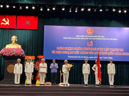 TĐKT - Chiều ngày 22/7, Phó Viện trưởng Viện Kiểm sát nhân dân tối cao (KSNDTC) Nguyễn Huy Tiến thừa ủy quyền Chủ tịch nước đã trao Huân chương Độc lập hạng Ba cho Viện Kiểm sát nhân dân cấp cao (KSNDTCC) tại Thành phố Hồ Chí Minh để ghi nhận những thành tích xuất sắc của đơn vị.