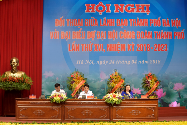 TĐK T - Chiều 24/4, UBND TP Hà Nội tổ chức Hội nghị đối thoại giữa lãnh đạo thành phố với các đại biểu dự Đại hội Công đoàn TP Hà Nội lần thứ XVI, nhiệm kỳ 2018 - 2023. Ủy viên Trung ương Đảng, Chủ tịch UBND TP Hà Nội Nguyễn Đức Chung, Chủ tịch Liên đoàn Lao động (LĐLĐ) TP Nguyễn Thị Tuyến, Trưởng Ban quản lý các Khu công nghiệp và Chế xuất (KCN&CX) Phạm Khắc Tuấn chủ trì Hội nghị.