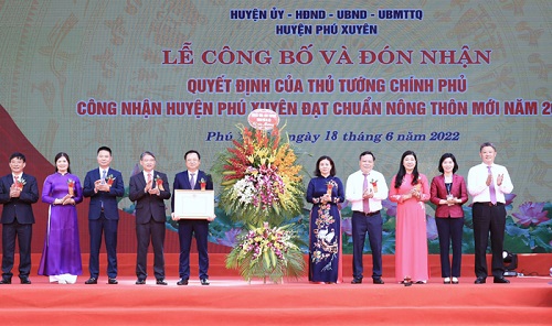 Ủy viên Trung ương Đảng, Phó Bí thư Thường trực Thành ủy Hà Nội Nguyễn Thị Tuyến cùng lãnh đạo TP Hà Nội trao Quyết định đạt huyện chuẩn nông thôn mới và tặng hoa chúc mừng huyện Phú Xuyên ngày 18/6