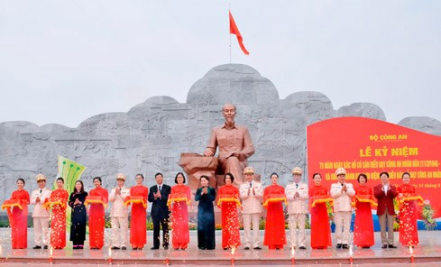Chủ tịch Quốc hội Nguyễn Thị Kim Ngân, lãnh đạo Bộ Công an cùng các đại biểu cắt băng khánh thành Khu lưu niệm Sáu điều Bác Hồ dạy CAND