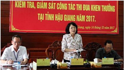 TĐKT- Ngày 14/12, Đoàn công tác của Hội đồng Thi đua - Khen thưởng (TĐKT) Trung ương do Ủy viên Trung ương Đảng, Phó Chủ tịch nước Đặng Thị Ngọc Thịnh, Phó Chủ tịch thứ nhất Hội đồng TĐKT Trung ương, làm Trưởng đoàn đã đến kiểm tra, giám sát công tác TĐKT tại tỉnh Hậu Giang năm 2017.