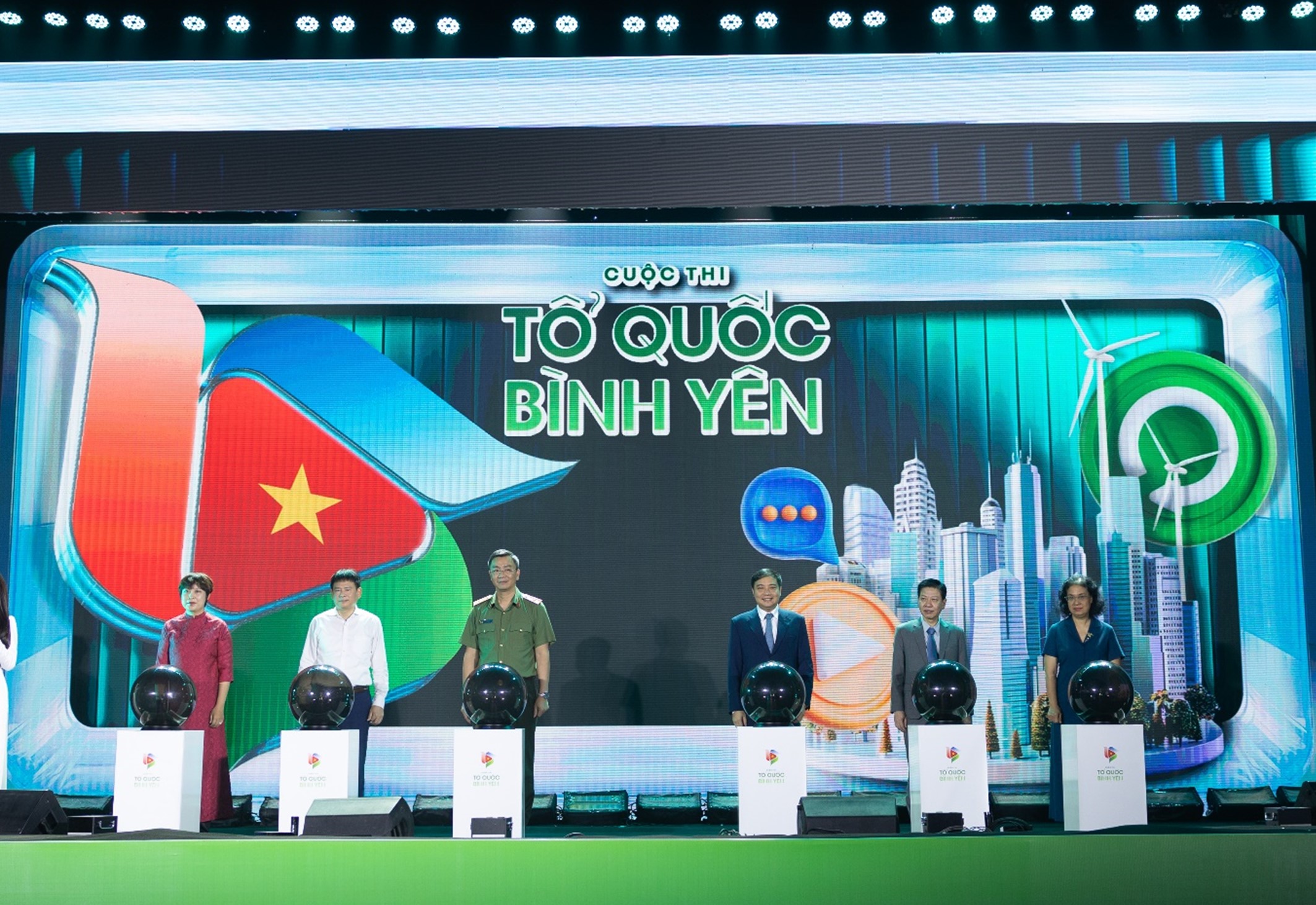 Các đại biểu thực hiện nghi thức bấm nút khởi động Cuộc thi sáng tạo video "Tổ quốc bình yên" năm 2026